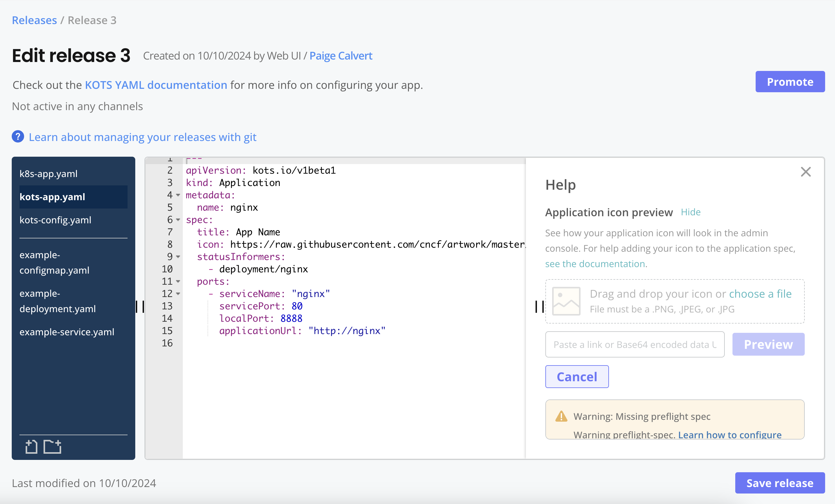 Create and promote a new release with your changes. For more information, see Manage Releases with the Vendor Portal or Managing Releases with the CLI.